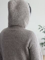 Aiyue is a seamless top-down knitted sweater. It stands out with its soft hood and subtle textured stripes at the bottom of the body, on the sleeves, and on the hood. A cosy and modern sweater, perfect for a simple and elegant look.