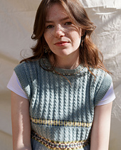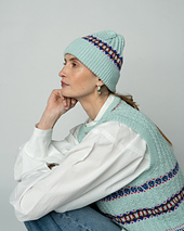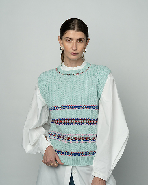 The Kunna Slipover is an elegant piece that can be worn either on its own or layered. It is knitted in a mix of 3-in-3 mock cables and beautiful colourwork borders. The slipover is worked in Highland Mini combined with Wool Cotton for the pattern borders.