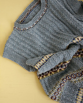 Kunna Slipover is worked bottom up in textured knitting and stranded colourwork. The body is worked in the round to the underarms, and the front and back are worked separately in textured knitting. Finally the neckband and armhole bands are worked.