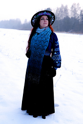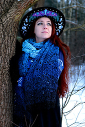 Leśnica (Forest Maiden) is an openwork crochet scarf made in two pieces seamed together, featuring a striking motif of leaves and buds arranged in vertical stripes. The pattern is composed primarily of post stitches and popcorns. Natural, plant-inspired, feminine, and full of magic.
