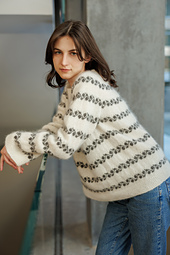 Piccolo Fiore is a top-down yoke sweater, that incorporates a beautiful colour work motif that features small flowers on a vine. Its casual and oversized fit make it perfect for pairing with jeans or a skirt. It is knit using mohair held with another lace weight yarn for the body, and mohair held doubled for the colour work motif.