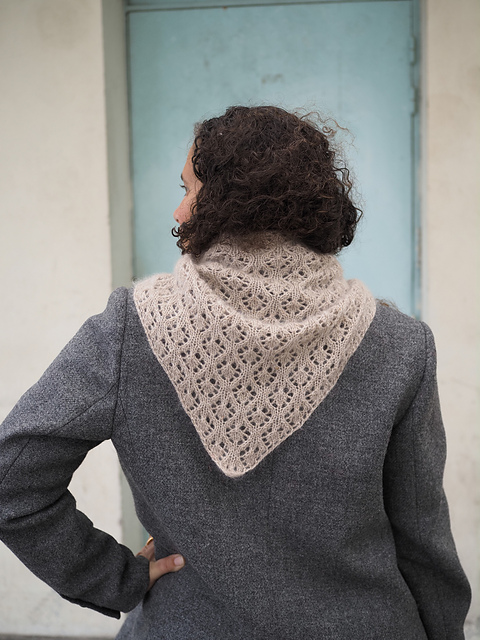 It's knitted from the point up, making it easy to adjust the size to your desired dimensions or the amount of yarn you have. The lace stitch requires concentration but is easy to knit (knit and purl stitches, yarn overs, decreases). The stitch pattern is provided in both written form and as a chart.