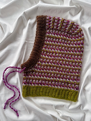 Worked top-down, this Tunisian crochet hood has a visually striking stitch pattern created by alternating stitches and strategic color changes. The hood can be worked with any odd-number of yarn colors, but 3 or 5 colors work best. The design looks more complicated than it seems, but this pattern is not recommended for beginners.