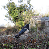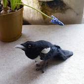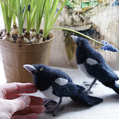 Knitted up Magpie measures, from tip of tail to tip of beak, approx. 19cm/ 7.5in; 10cm/ 4in tall
