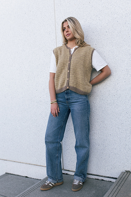 Knitting kit with yarn and free digital knitting pattern for a simple striped vest for women. The vest is in the same series as the Island sweater. Knit from the bottom up, back and forth in one thread Hip Wool. Simple narrow rib around the sleeves, neck and placket with nice details.