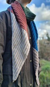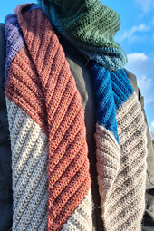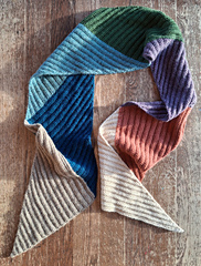 This scarf is made of seven triangles in alternating directions, picked up and worked onto each other successively using a double-sided slip stitch ribbing pattern (so there is no wrong side!). It is a great way to use up single skeins of yarn in your stash as each triangle is made from one 100 m / 109 yd skein of DK weight yarn. It can be worn open in the traditional way or can be sewed closed into a loop to make an infinity scarf with a twist.