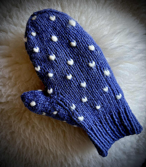 This pattern shows detailed pictures on how to add in the roving pits as you knit. It will also show pictures of how to make your roving bits to add to the mitten.