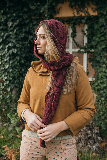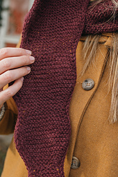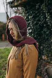 The Apple Hood is worked seamlessly in one piece from the crown to the tips. It is worked flat, back and forth in garter stitch, and it features a lovely i-cord border.