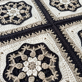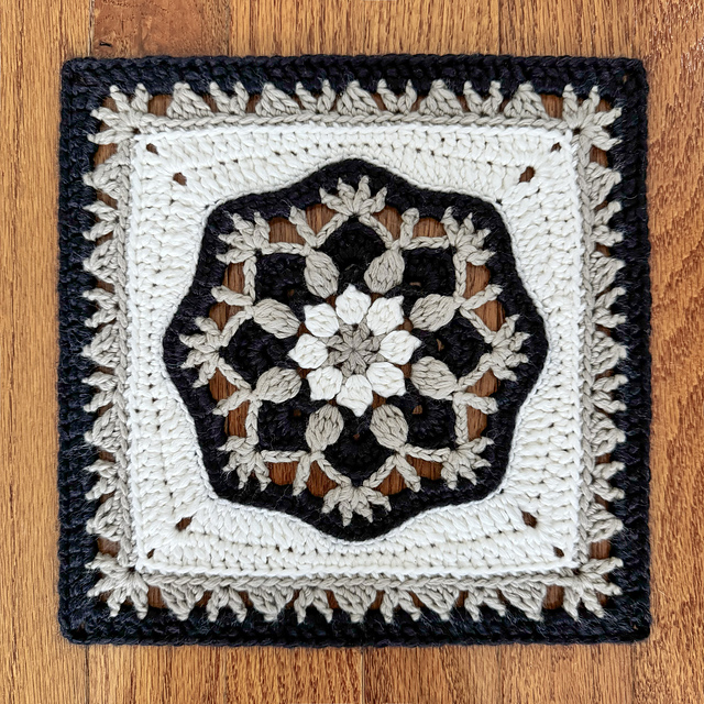 Create this stunning afghan square using just 3 colors of yarn - the black/tan/off white combo is perfect for a neutral aesthetic, but you can always choose your own color scheme of a dark, mid and light tone in whatever palette you prefer.