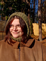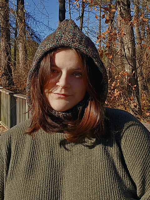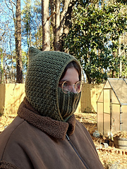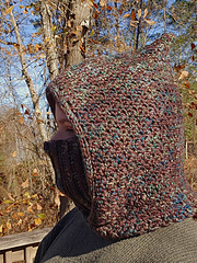 The Spellbark Hood is a one piece construction that begins with a ribbed face covering, followed by a hood picked up along the edge of the rib, and concludes with an applied i-cord edge. Designed with negative ease for the face/neck covering before blocking, with an oversized hood.