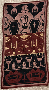 If you’ve ever dreamed about scaring all your friends when they come over, or if you just really really like vampires, then this blanket is for you! This blanket uses the overlay mosaic technique and only 3 basic stitches which makes it a perfect project if you’re just getting into mosaic and want to do something on the larger side.