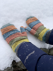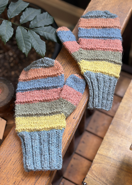 Mittens may be worked in one solid, tonal, or variegated yarn; with multicolor stripes (as shown); or with two alternating colorways.