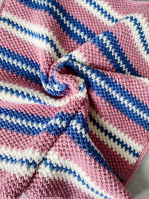 The blanket is worked flat in rows followed by a border worked in rounds.