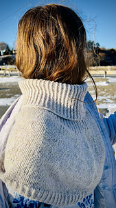 This little capelet is worked from the bottom up, beginning with twisted stitch ribbing. Stockinette is worked over the arms and chest, with decreases at the shoulders before the neck is completed by a cozy collar of twisted stitch ribbing.
