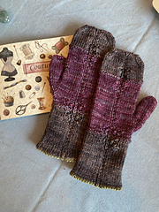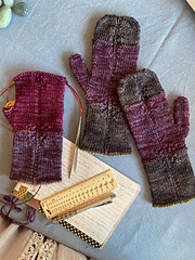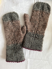 These quite elegant mittens are knitted up in 2 sample versions, one in a worsted weight yarn, one in Nutiden unspun yarn held together with Holst Tides. One with a single and one with a double layered cuff, instructions for both are included in the pattern.