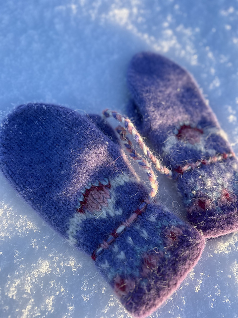 Viddevotten is knitted with the Norwegian mountain plateau (vidda) in mind – the silence of open landscapes, low mountains meeting the sky, and snow that muffles the sounds around you. The colors are inspired by the sun gently coloring the winter landscape in pastel tones, and by the northern lights quietly dancing across the horizon. Purple is a dominant color in the pattern, giving the mittens a sense of calm, warmth, and something almost spiritual.
