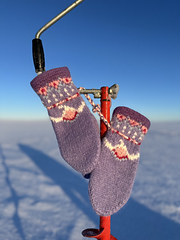 Viddevotten er strikket med vidda i tankene – stillheten i åpne landskap, lave fjell som møter himmelen, og snø som demper lyden rundt deg. Fargene er inspirert av sola som farger vinterlandskapet mykt i pastell, og av nordlyset som stille danser over horisonten. Lilla er en bærende tone i mønsteret og gir vottene et uttrykk av ro, varme og noe litt åndelig.
