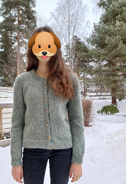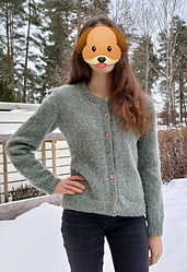 Än så länge finns den bara i storlek S. Bröstvidden på den färdiga koftan är ca 94 cm.