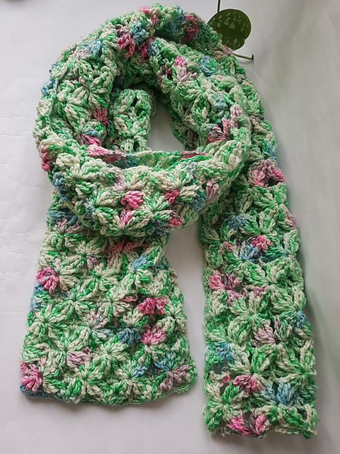 The scarf begins with a foundation chain, and the Snowflake pattern repeats across rows to form the design.