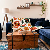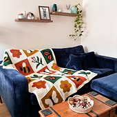 The pattern is worked using intarsia crochet and single crochet stitches, creating clean, graphic designs with strong visual impact. Each square is worked individually, then joined together before finishing with a textured border. Working square by square makes the project feel manageable, while still resulting in a striking finished blanket.