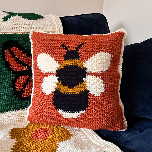 This cushion is part of the wider Bloom & Buzz collection, which also includes a coordinating butterfly cushion and the Garden Medley Blanket. All of the designs share the same garden-inspired motifs and color palette, making it easy to mix and match pieces or create a cohesive handmade set for your home.