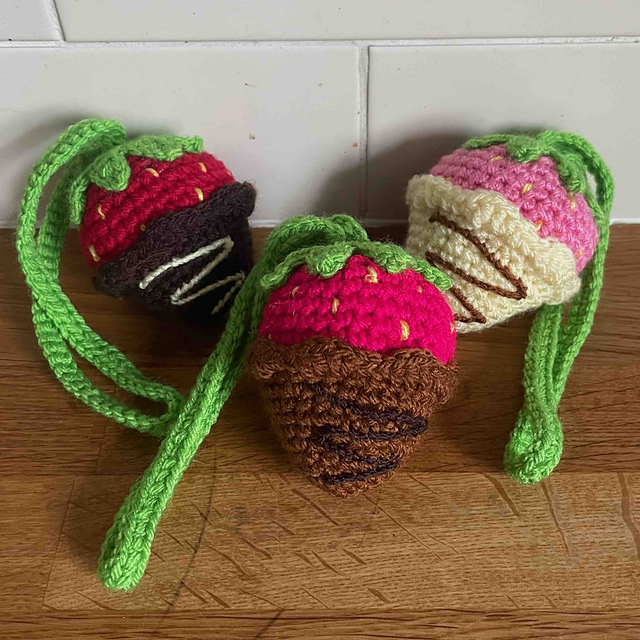 This is a free crochet pattern of a chocolate strawberry bag charm.