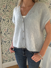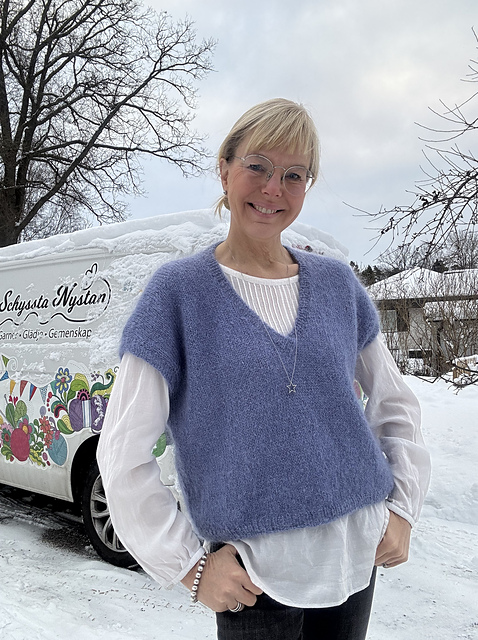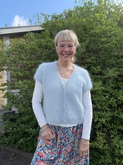 Mysig oversizeslipover i gosig mohair, Bella från Permin, som stickas uppifrån och ner. Axlarna formas med förkortade varv och slipovern stickas runt under ärmhålen. Den ljusblå med knäppningen är sk falsk knäppning och även den stickas runt. Resårkanten plockas upp efteråt.