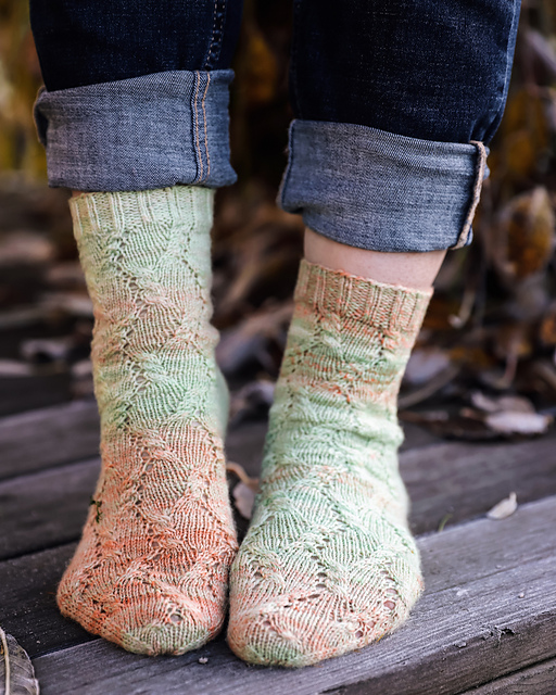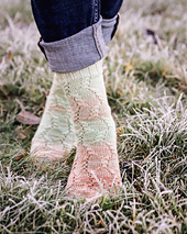 Any fingering weight sock yarn (75% wool/merino, 25% polyamide, 400 m / 100 g). The sample socks are knit with handspun yarn.
