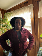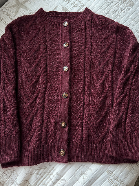 The wine Ovie cardigan is knit in Lamana Como Grande in color 16 Bordeaux and Lamana Premia in color 16 Bordeaux.
