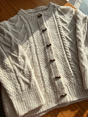 The Ovie Cardigan is a top-down drop shoulder cabled cardigan. First, stitches are cast on for the back and worked back and forth with German short rows. The two fronts are knit back and forth with increases for the neckline. The pieces are then joined together to continue knitting flat. The sleeve stitches are knit in the round on shorter circular needles or double pointed needles.