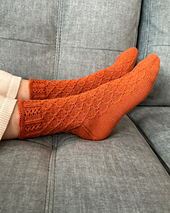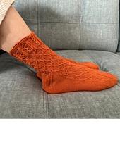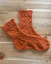 They are worked toe-up, starting with a Turkish cast-on. The toe is worked in stockinette stitch. The foot then combines a stockinette stitch sole with an instep decorated with a motif of slipped stitch cables, evoking the mosaics of the Roman villas of the region.