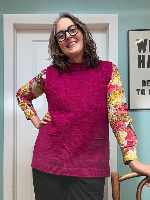 This is a Bottom Up pullover vest knit flat, seamed then joined at the neck and ribbing is knit in the round. All decreases are worked as described in the Stitch glossary. You may use any decrease you like if this one does not suit you. Fit is meant to be relaxed. The sample bust measurement is 44 in. The model has a 38 in bust.