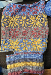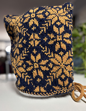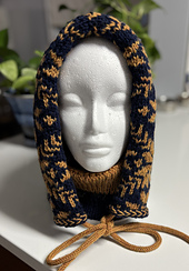 This hooded cowl comes in one adult size with a gauge of 6 stitches to the inch over the colorwork section. Although there are many techniques used in this hood like stranded colorwork, Latvian braid, grafting, and steeking, they are all well explained and small, manageable amounts of each technique.