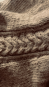 Details: Continuous cable panel, ribbed neckline, cuffs, and hem
