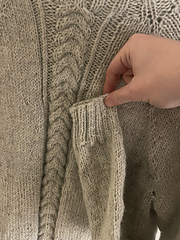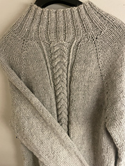 Worked top-down in the round with classic raglan shaping, the design pairs clean stockinette with a sculptural center cable. The result is modern, timeless, and quietly striking.