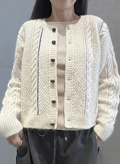 ラインコアカーディガンは縦に伸びるラインと縦方向に流れるような模様の配置がポイントのアランカーディガンです。