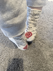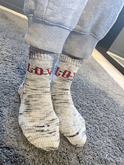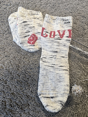 The pattern includes two charts: one for the text on the leg and one for the rose that decorates the heel flap. For the colorwork, the ladder back technique is used to secure the contrast color and create a flexible, well-balanced fabric.