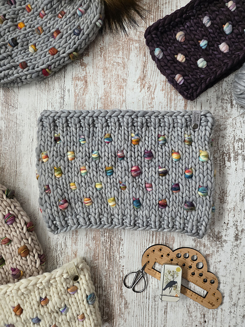 The pattern uses Super Bulky yarn, or yarns held together to make Super Bulky gauge. I have written the pattern for one size with suggestions for altering it if needed.