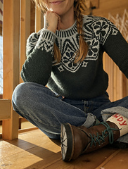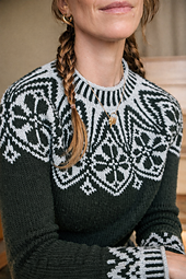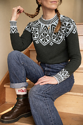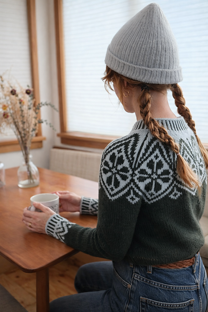 Sitzmark is knit from the top down in the round featuring short row shaping for the back neck and a bold yoke motif and colorwork sleeve details.