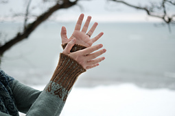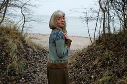 The sand-coloured sweater is made from "Lopi Einband" by Istex, 100% Icelandic wool, 50 g / 250 m. MC is shade 0886, CC1 is "Maschenwunders Hamburger Wolle" , 100% Islandschaf in colour "Lilo", CC2 is "Lopi Einband" Shade 9132.