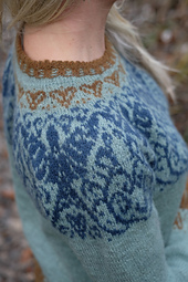 What makes this sweater stand out, besides the extra-wide, two-tone cuffs, are the ornamental details in the yoke. The floral pattern with birds is reminiscent of Art Nouveau ceramic tiles. While the sweater has a feminine look at first glance, it will certainly flatter anyone who appreciates a beautiful yoke.