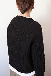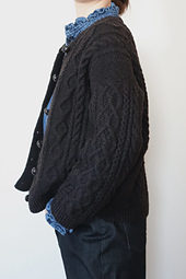 **Hoff Aran Cardigan** is a drop-shoulder cardigan featuring classic Aran patterns.