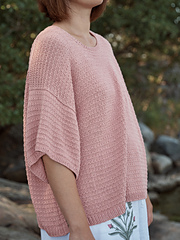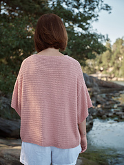 *Artist* is a fun and relaxed oversized T-shirt with dropped shoulders and extra-wide, elbow-length sleeves. The shirt has a very minimalist and simple stitch pattern, which makes this both an enjoyable and interesting knitting project. The generous width of the body and sleeves give a nice playfulness for the otherwise minimalist design, and Pauliina Leisti chose silk yarn for a cooling and luxurious feel. This garment has a certain bohemian feel to it, which inspired the name Artist.