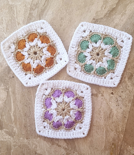 Create a charming floral crochet square,perfect for blankets,cushion,or other home decor projects.This pattern uses 3 colors worked one at a time to form a layered flower motif in the round.Each square measures approximately 10-12 cm(4-5 in)and is quick and easy to make,ideal for beginners or anyone looking to brighten their projects with a splash of color.