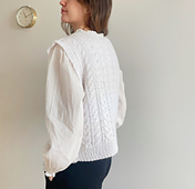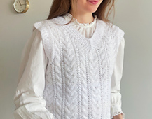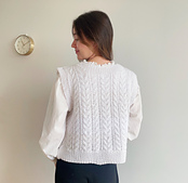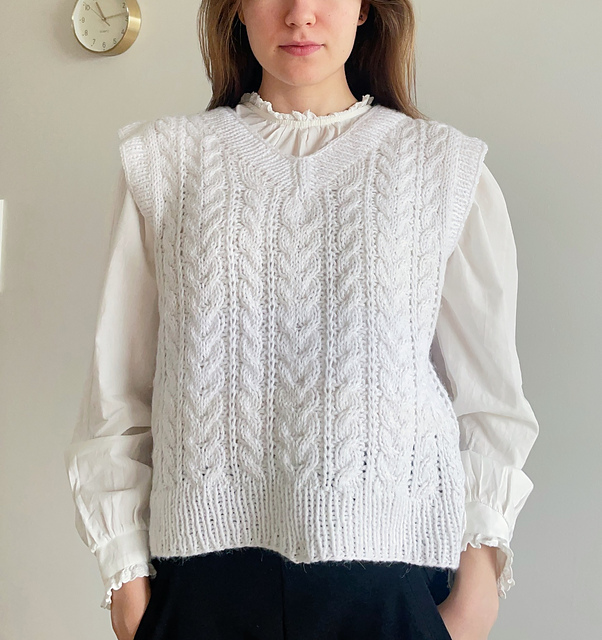 The Alava-vest is knitted from thick alpaca-wool yarn with cable details. The vest is knitted from the bottom up using cables in different directions. The beautiful details between the cables are created by knitting half-brioche stitches.