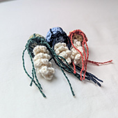 These tiny jellyfish are a fun and quick project. You can use them as keychains or hang them up in a room or car. You can use any color, so they are a great way to use up scraps! I used thin cotton yarn, but you can use any yarn you have in your stash, just keep in mind, the bigger the yarn, the bigger your jellyfish will turn out.