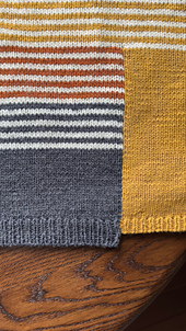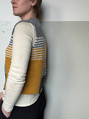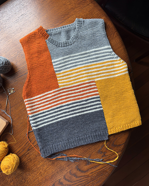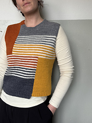 … is a modern study in line and shape. Worked top-down in separate front and back pieces, it keeps the intarsia simple by working it flat and reveals the full composition once the panels are joined. The armholes are shaped cleanly as you knit flowing naturally into the side seams, which stabilize the fabric and give the garment structure— this makes the design especially ideal for single-ply yarns.