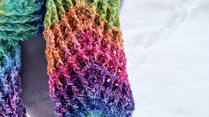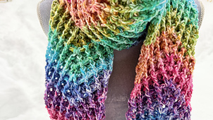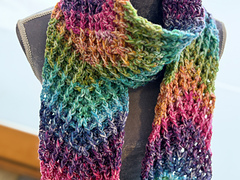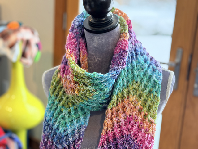 Crochet the waffle stitch in a chevron format for a really thick crochet scarf. Using Red Heart Super Saver Bitty Stripes, the yarn just plays its own colourway, looking incredible. Easy to follow 6-row repeating pattern.
