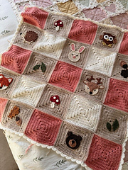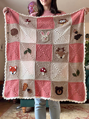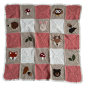 Crochet pattern for a baby blanket with woodland themed appliques.