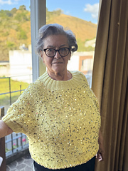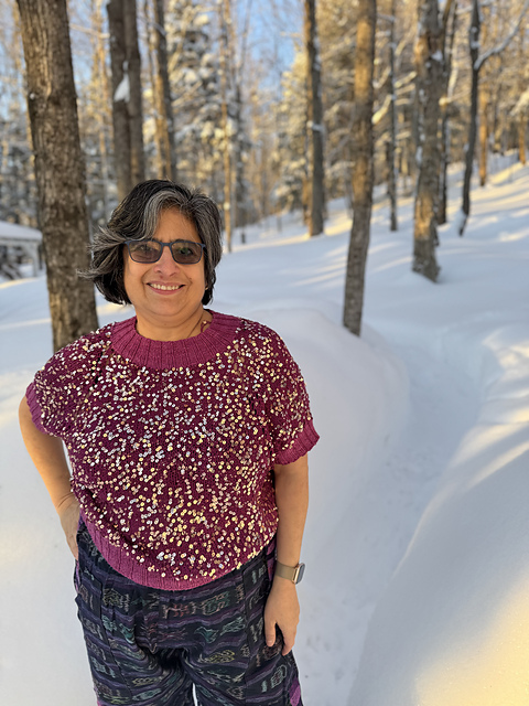The Supernova Tee is a great way to show off Mont Tricot’s Sutton Glitz. The original is knit with 2 strands of Sutton Glitz held together (Berry Color). You can also knit it with 1 strand of dk and 1 strand of Glitz for a mini nova, less bling, tee (yellow colorway shown.). I call this the mininova.